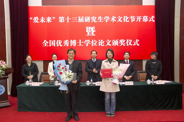 2013年4月7日下午,上海外国语大学第十三届“爱未来”研究生学术文化节开幕式暨全国优秀博士学位论文颁奖仪式在松江校区图文信息中心西厅隆重举行。上海外国语大学校长曹德明教授、副校长冯庆华教授、研究生部主任汪小玲教授、党总支书记韩殿秀老师以及校团委副书记邓佳老师在主席台就坐,开幕式暨颁奖仪式由研究生部主任汪小玲教授主持。