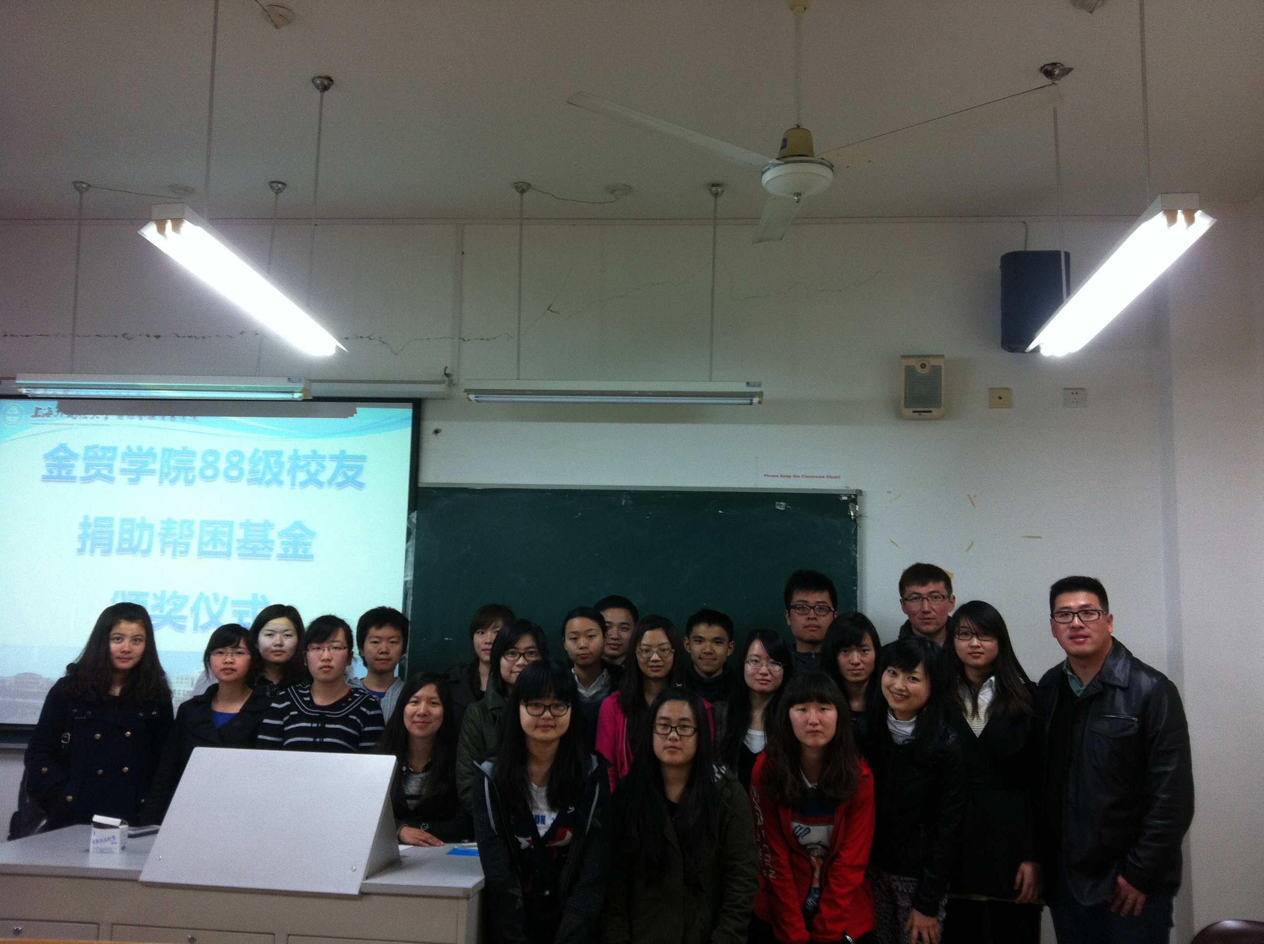 4月23日中午,上海外国语大学国际金融贸易学院88级校友捐助帮困基金颁奖仪式在松江校区金贸学院举行。国际金融贸易学院党总支书记忻炯俊老师、辅导员叶玮老师代表出席了颁奖仪式。学院负责帮困助学工作的刘飞老师主持了颁奖仪式。