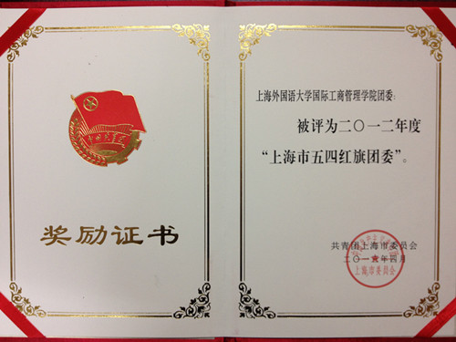近期,根据沪团委文件《关于表彰2012年度“上海市五四红旗团委(团支部)”的决定》,上海外国语大学国际工商管理学院分团委荣获2012年度“上海市五四红旗团委”荣誉称号。2012年3月,国际工商管理学院分团委以优异成绩晋级全市前20强,入围2012年度“上海市五四红旗团委标兵”差额答辩环节,创造了上海外国语大学院系分团委的最好成绩。