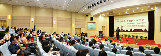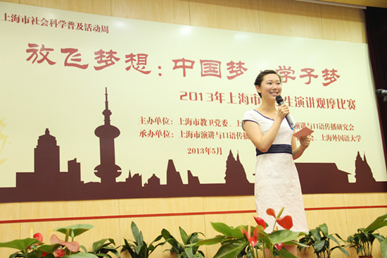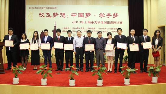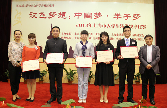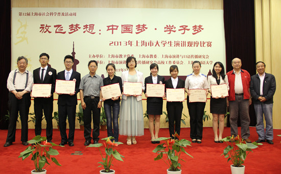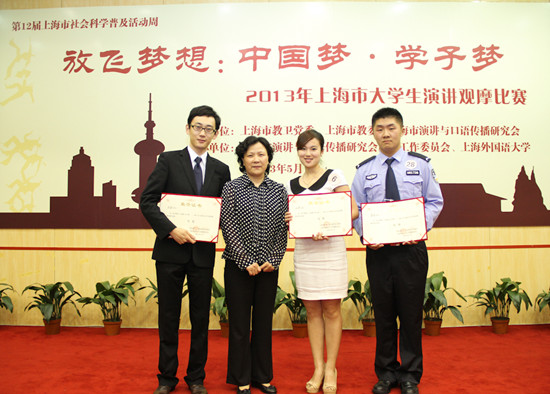 5月27日,由上海市教卫党委、上海市教委、上海演讲与口语传播研究会等共同主办,上海外国语大学等承办的主题为“放飞梦想:中国梦·学子梦”的2013上海市大学生演讲比赛决赛在上海外国语大学举行。来自上海戏剧学院的马聪,上海师范大学的王博和上海公安高专的李磊等3名选手赢得决赛一等奖。上海外国语大学党委副书记、纪委书记王静教授为获得一等奖的3名选手颁奖。