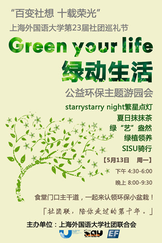 作为第二十三届社团巡礼节的第二个品牌活动,绿动生活”环保游园会于5月13日下午在校园内如火如荼地开展。本次活动由上海外国语大学社团联合会主办,由来自上海外国语大学、东华大学、上海对外经贸大学以及立信会计学院在内的四所高校的十余个环保社团共同协办。