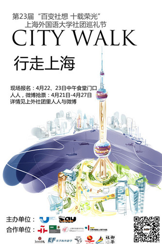上海外国语大学社团巡礼节"CITYWALK 行走上海" 系列活动旨在让同学们能以轻松有趣的方式感受异域风情,感悟历史,探索文化,并在团队协作中收获友谊和能力。用自己的双脚丈量上海,运用知识,在行走中发现文化之美。同时加深大家对小语种文化的认识,推广上外独有的小语种文化类社团,打造出社团品牌。