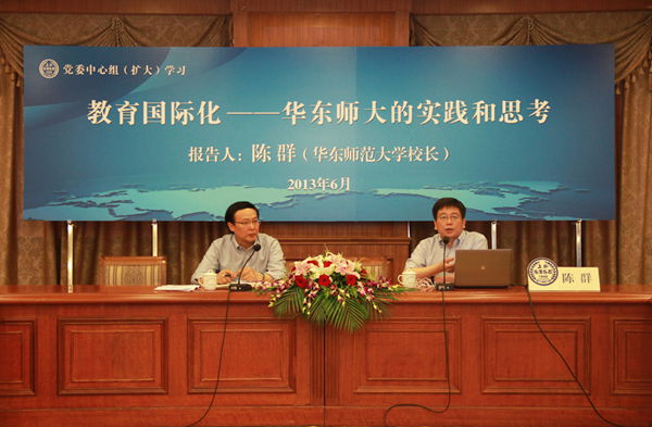 6月6日下午,华东师范大学校长陈群教授应邀为上外党委中心组成员(扩大)做了题为《教育国际化——华东师大的实践和思考》的辅导报告。校党委书记吴友富、校长曹德明、党委副书记李月松、王静,副校长冯庆华、张峰、周承,校长助理庄智象等出席集体学习报告会。学习报告会由校党委委员、党委宣传部部长陈万里教授主持。