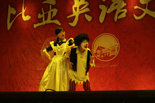 首先登台表演的是喜剧《驯悍记》。人们常说女人如水,但莎翁笔下的凯瑟丽娜却似火,她一身傲气,仿佛嘲笑着世俗男子,嘲笑他们用婚姻、爱情和金钱衡量着人生。拜读经典,由2011级英语语言文学4班、翻译2班和翻译3班组成的《驯悍记》剧组将这一莎翁经典喜剧搬上舞台。经过编剧精心改编,剧组选取男女主人公初见、婚礼和探亲的三幕向大家展现了文艺复兴时期人们的婚姻观与幸福观。全剧最精彩的莫过于硬汉与悍妇的对手戏。为了演好一幕幕驯悍表演,男女主角绞尽脑汁,倾尽全力,表演活灵活现。台上三十分钟,观众阅尽众生百态,殊不知这更是导演、编剧、演员、灯光、道具、场务等几十名同学共同努力的结果。剧终,“猛虎”被驯服,一切辛劳得到回报,似乎皆大欢喜。但智慧如莎翁,欢笑背后留给我们的往往是深刻的思考和感悟。