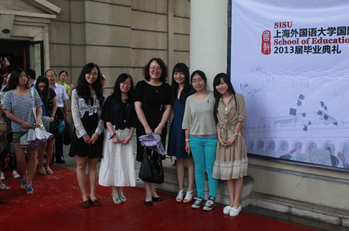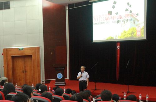 6月7日下午,国际教育学院13届毕业典礼暨毕业晚会在图文西厅举行,窗外大雨滂沱丝毫没有影响参加典礼的师生们的激情,院长贺云老师、党总支书记沈志强老师、三十多名教师、2013届全体毕业生“欢聚一堂共同纪念一起走过的四年时光。典礼按照内容分为三个环节:典礼-联欢-留念。