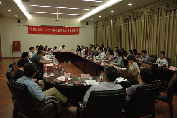 6月17日上午,我校在松江校区图文信息中心J110室举办“我想对你说”——2013届优秀毕业生代表座谈会。校党委副书记李月松教授、副校长张峰教授及学校各职能部门领导、老师出席了会议,来自全校各院系的29名优秀毕业生参加了此次会议。会议由学生处处长毕昆鹏主持。