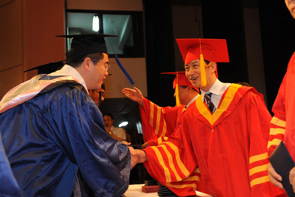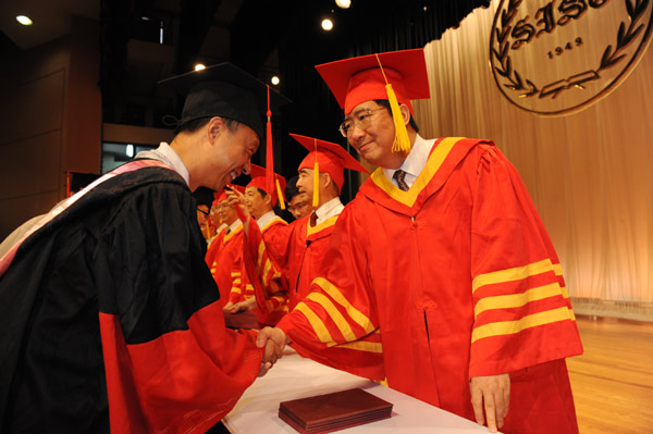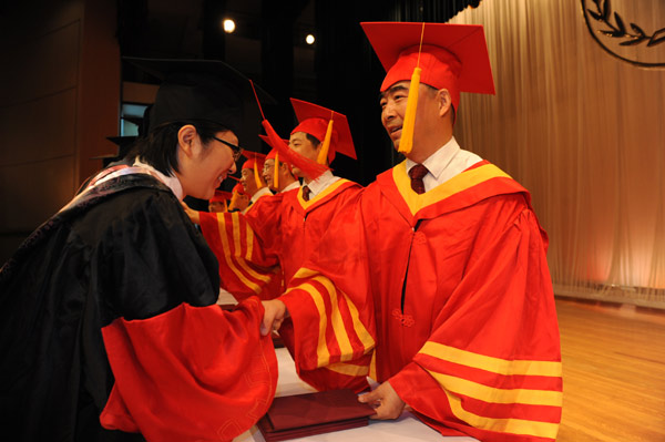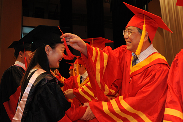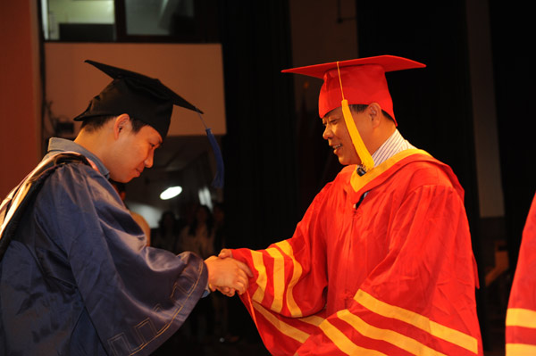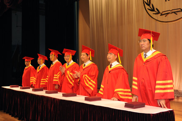 在庄重的音乐声中,毕业研究生依次走上主席台,校领导为他们“拨穗”授予学位和颁发证书。学位授予仪式后,校领导、导师代表和全体毕业生在逸夫会堂内合影留念。
