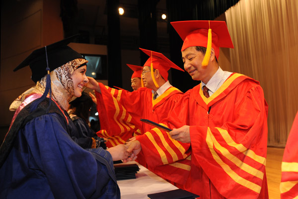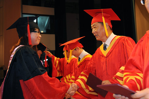 曹德明校长肯定了本届秋季毕业研究生在过去几年中的表现:博士研究生或独立或与导师合作,在CSSCI来源期刊上发表了论文70余篇,其中包括在《外国教学与研究》、《外国语》、《外语界》、《国际政治研究》、《国际观察》、《中国翻译》等业界知名刊物上发表的高水平论文,显示了学术研究的实力和潜力;130多名研究生参加了境内外国际学术会议并宣读论文;“外语与文化”上海市研究生学术论坛吸引了上海、长三角乃至全国各地研究生的踊跃投稿;同学们在复旦、上外、浙大等多所著名高校共同举办的研究生学术论坛上充分展示了上外研究生的风采;“博士沙龙”已成为上海市颇有影响的学术品牌项目。5名同学获得留基委或富布莱特子项目的资助,赴美国、德国、以色列、比利时等国访学,有12名同学通过校际交流、参加国际学术会议等方式赴境外研讨。曹校长说,这些经历将化为同学们未来人生路上的宝贵财富。