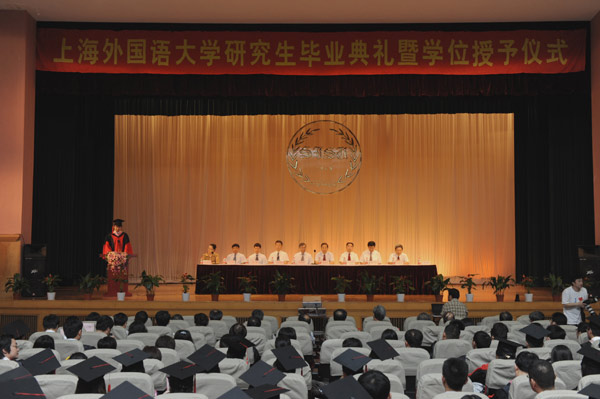 6月27日上午,我校2013届秋季研究生毕业典礼在虹口校区逸夫会堂举行。上海外国语大学党委书记吴友富、校长曹德明、校党委副书记李月松、副校长冯庆华、张峰、杨力、周承等校领导、博士生导师、部分硕士学科点负责人及毕业生亲友出席了毕业典礼暨学位授予仪式。毕业典礼由研究生部主任汪小玲主持。