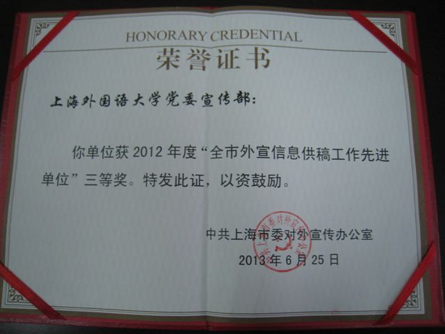 7月2日下午,上海市委对外宣传办公室、市政府新闻办召开全市外宣信息供稿先进单位表彰会。市委外宣办副主任徐威宣读了全市外宣信息供稿先进单位表彰名单。上海外国语大学党委宣传部获2012年度“全市外宣信息供稿工作先进单位”三等奖。 据了解,上海外国语大学是获得2012年度“全市外宣信息供稿工作先进单位”荣誉表彰的本市唯一一所高校。(缪迅)