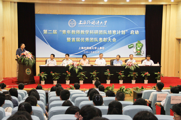 上海外国语大学第二届“青年教师科研团队培育计划”暨首届优秀团队表彰大会7月3日在虹口第一报告厅胜利召开。出席大会的领导有校党委吴友富书记、曹德明校长、王静副书记、冯庆华副校长、张峰副校长、杨力副校长和周承副校长,与会人员包括相关职能部门领导、各院(系、所、部)领导、首届优秀团队和第二届团队指导老师、核心及成员。大会由校人事处孙信伟处长主持。