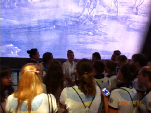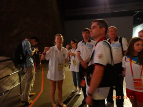 本届运动会,以“欢乐与友谊”为主题,穿插丰富多彩的中俄青少年文化交流活动,其中俄罗斯体育代表团参观中华艺术宫的接待和讲解工作,由我校留学生承担。7月11日下午14:30,活动正式开始,来自俄罗斯的体育代表团分批次进入展示场地。作为留学生的两位俄罗斯姑娘主动上前招呼同胞,让俄罗斯代表团很是惊喜。中华艺术宫是中华文化的圣殿之一,尤其是动漫《清明上河图》展区是中华艺术宫最精彩、最能代表中国传统文化的部分,两位留学生用自己的母语认真地为自己国家的代表团讲解其中的文化内涵,效果特别好。由于场地限制,不能使用扩音器,她们都尽最大努力提高着自己的声音。等到分批次送走200人的大团队之后,她们的嗓音都已沙哑,在场的工作人员都不禁纷纷竖起大拇指称赞她们。