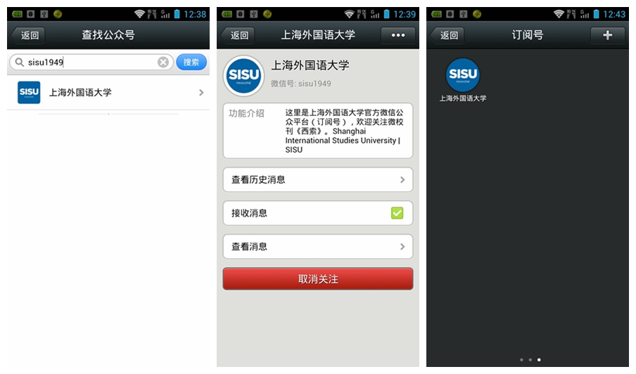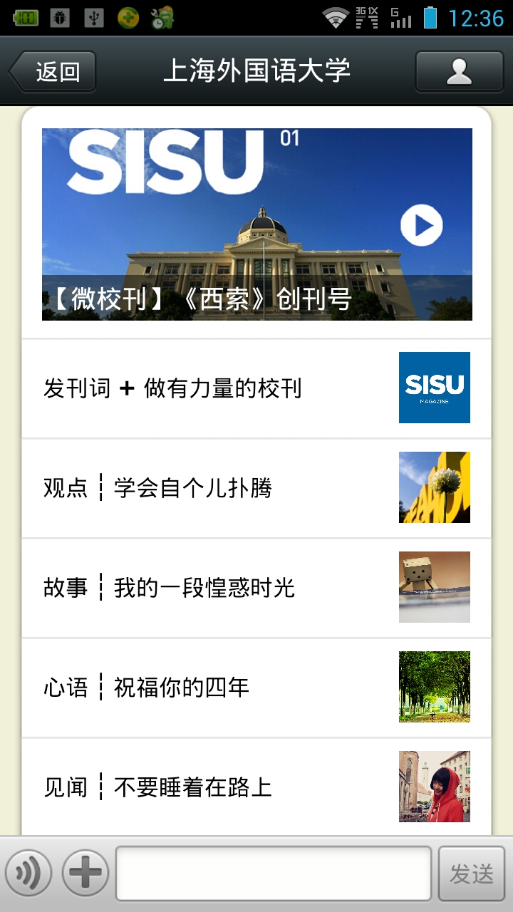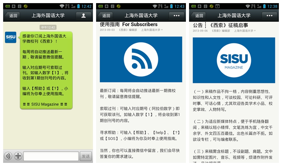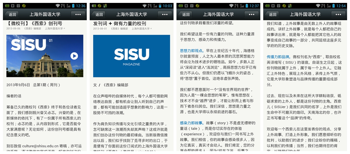 目前,上海外国语大学微信公众平台由服务号“西索儿”(SISUers)和订阅号“西索”(sisu1949)两大体系组成。其中,订阅号以微校刊《西索》的形式进行每周一期的主动推送服务,读者也可通过输入对应期号索取过刊进行浏览。(顾忆青)