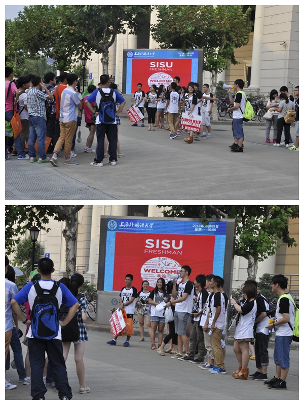 在今年的迎新工作中,校园中不再拉各种横幅,而是通过电子屏的精美图文向新生们表达了诚挚的祝福和热烈的欢迎。来云南的国际工商管理学院的李同学说她很喜欢上外的校园,不仅建筑,而且电子屏上的迎新标语、报到现场的双语铭牌等都展示着国际化的氛围。