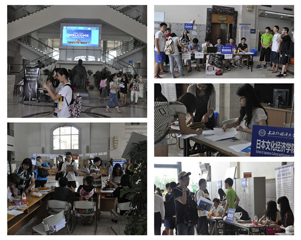迎新现场,各院系都准备精心了活动和材料,东方语学院的《新生特刊》设计精美、图文并茂,以杂志的形式用生动活跃的文字向新生们介绍了上外的学术、生活、交通、周边旅游等,学长学姐们还手工制作了手摇扇,迷排队等候的新生们送去清凉。英语学院的《英华动态》新生特刊则用彩色版面刊印了院长查明建、导师高健、辅导员熊颖哲三位老师的寄语《此是英华正茂时》、《导师的遗憾与反思》、《菜鸟远行》。法学院则制作了“大法官”的模型,新生们在报到时“穿戴”“大法官”的长袍摄影留念。国际工商管理学院的学长学姐们穿着整齐的统一红色T恤衫热情地接受学弟学妹们的问询。团委从9月5日起就在地铁站安排了迎新志愿者,在报道现场也开始了社团招新和宣传。学生处为家庭经济困难学生准备了大礼包。保卫处为新生发放《安全手册》。学校后勤实业发展中心的员工们从9月5日就开始加班加点迎接新生入住学生公寓。