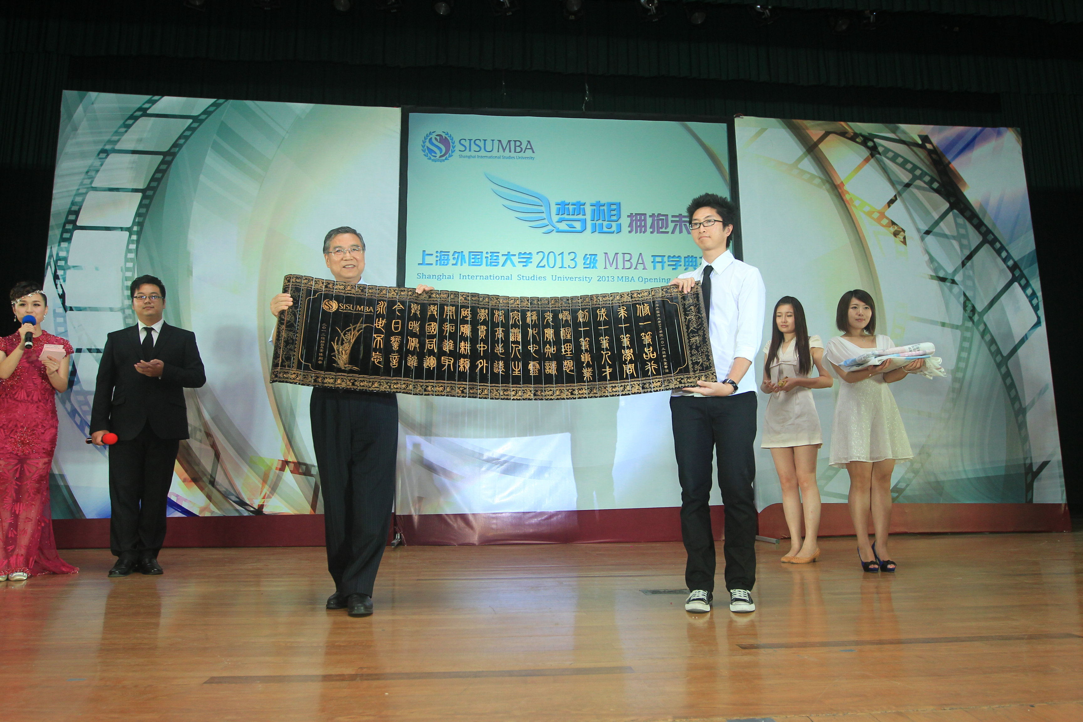 紧接着上海外国语大学党委书记吴友富教授代表上外接受了2013级MBA新生的礼物——代表着新生向母校承诺的誓言竹简,以及请母校为自己见证的梦想旗帜。最后,分管MBA工作的副校长冯庆华教授受邀登台为2013级MBA全体新生“参演’的“电影”《上外MBA-梦想开始的地方》开机仪式,预示着未来的两年半里,2013级新生即将开始在上外MBA上演更加精彩的“故事”。