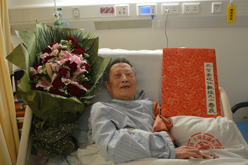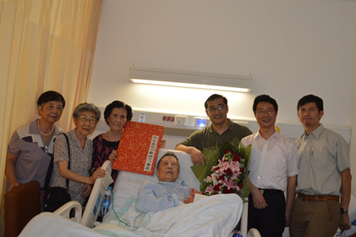 9月10日,英语学院院长查明建、党总支书记李尚宏和教师代表带着大家的祝福,来到李观仪教授的病房,向她献上鲜花,逐页展示祝寿薄内容,转达学校领导和同志们的祝贺和敬意。听着大家对她的祝福,李观仪教授格外高兴,还数次流下了激动的泪水。她一再嘱咐在场同志,一定向全校关心她的领导和同志们转达谢意。在生日歌中,李观仪教授吹灭生日蜡烛,并为大家切蛋糕。