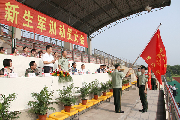 武警二支队承担了今年的军训任务,军训团副团长吴辉代表武警官兵进行了动员。他说,军训的目的是全面提高学生的整体素质,增强国防观念,培养严格的组织纪律观念,树立居安思危的忧患意识。成功从来只属于把理想付诸行动的人,他激励学生从自我做起,走好每一个步伐,喊好每一个口令,做好每一个动作,让青春的年华在未来的征途中放射出灿烂夺目的光彩!