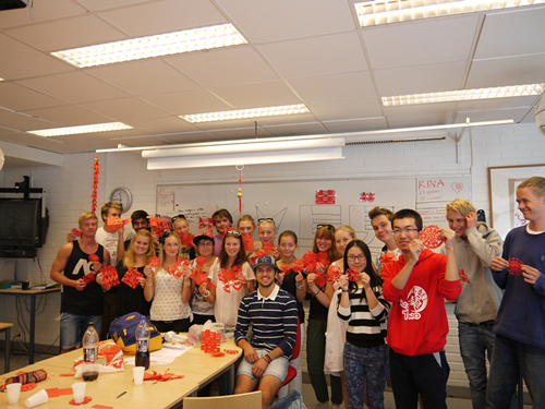 当然,上外师生代表团并没有忘记此行的主要任务——汉语文化周。对外汉语专业学生利用自己的专长,为瑞典师生安排了为期两周的中国文化体验活动,使他们在欢乐中感受中国传统文化。打头炮的是京剧脸谱教学。画脸谱分两个年级教学,第一节课从高二的一个班级开始。负责的同学带来事先准备好的空白脸谱、颜料以及画笔,利用视频等媒介展示了脸谱的魅力,并以“色彩”为切入点,引起同学兴趣。毕竟是第一堂课,负责的同学还是有些紧张,但在所有师生的积极配合下还是取得了很好的反响。第二天给高三班级上的脸谱课就娴熟并且淡定了许多,同学们的作品也更加呈现出千奇百怪却独具特色的姿态,让交流小组的成员忍俊不禁喜乐满怀。头炮打响后,接下来的活动也便越来越精彩与丰富,剪纸、太极拳、中国传统童年游戏等轮番上阵。在最后一天的告别会上,两校师生一起动手包起了饺子,一起表演节目,合影留念,在依依不舍中为这次交流画上了一个圆满的句号。