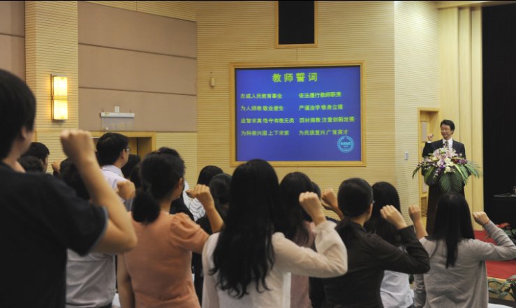 开班典礼上,副校长冯庆华宣读了2013年新进教工和指导教师名单。校工会常务副主席王祥兴主持了宣誓仪式,在上海市教卫党委系统“创先争优·师德标兵”查明建教授的领誓下,80位新进教职员工举起右手庄严宣誓:“忠诚人民教育事业,依法履行教师职责。为人师表,敬业爱生;严谨治学,修身立德。启智求真,恪守有教无类;因材施教,注重创新发展。为科教兴国上下求索;为民族复兴广育英才。” 每一位新教工都深切感受到作为高等教育工作者所应肩负的责任和使命。