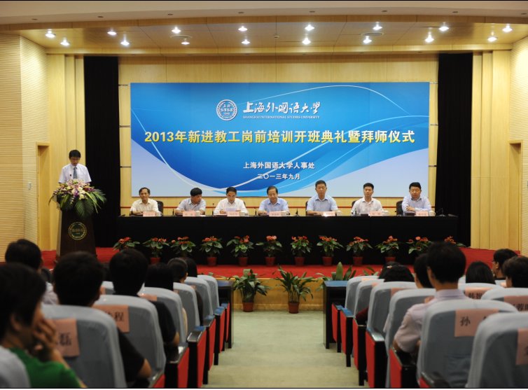 9月29日下午, 2013年上海外国语大学新进教工岗前培训开班典礼暨拜师仪式在虹口校区会议中心第一报告厅举行。校领导曹德明、李月松、冯庆华、张峰、周承、林学雷出席了典礼。学校有关职能部门领导、各院系分管教学负责人、2013年新进教职员工及其指导老师等参加了典礼。典礼由人事处处长孙信伟主持。