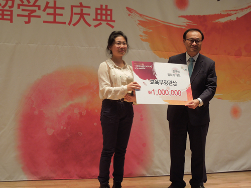 此次演讲比赛由韩国忠清北道和忠清北道知识产业振兴院主办,韩国文化体育观光部、外交部、教育部和驻韩中国大使馆协办的。据悉,目前在韩中国留学生已达六万余人,其中包括全国各高校韩语系选派的60余名优秀的国家公派留学生。易乐文同学作为上外选派的国家公派留学生一员,到韩国留学不到一个月就获此殊荣。