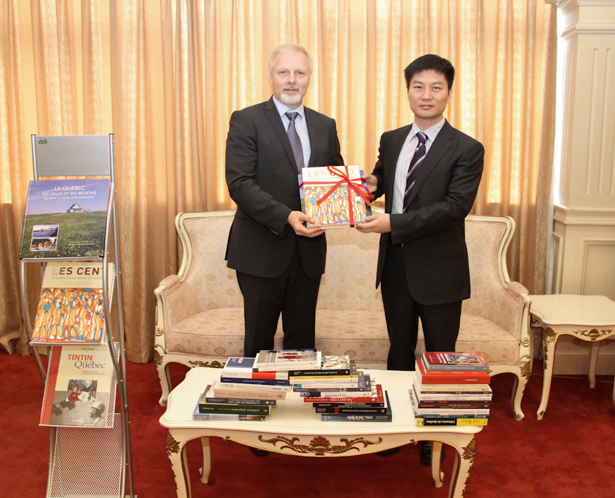 随后,里瑟部长向我校从事法语教学和魁北克研究的学者赠送了图书,并与张峰副校长共同见证了上海外国语大学与蒙特利尔大学的校际协议签署仪式。我校法语系主任肖云上教授与蒙特利尔大学人文与科学学院研究生教育及对外事务副院长塔尼亚·萨芭教授还就双方交流的具体内容进行了讨论。与会的其他老师和同学也就科研合作、校际交流等方面的内容与里瑟部长等进行了愉快的交流。