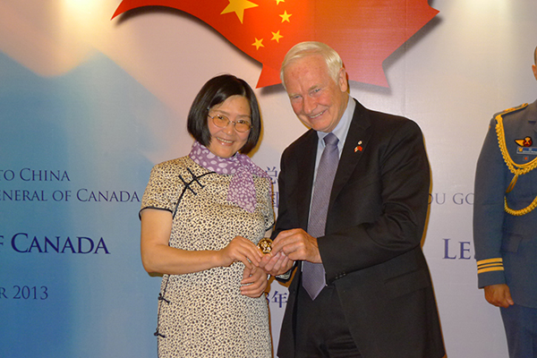 2013年10月20日,加拿大总督约翰斯顿(David Johnston)在上海亲自授予我校加拿大研究中心主任钱皓教授“加拿大总督国事访问奖章”,以表彰她为增进中加关系、学术交流所作出的学术贡献。共有八人获得此殊荣,其中五人为加拿大籍人,三人为中国籍人,钱皓教授为唯一来自上海高校的学者。 (图 / 加拿大驻上海总领事馆;文 / 加拿大研究中心)