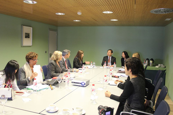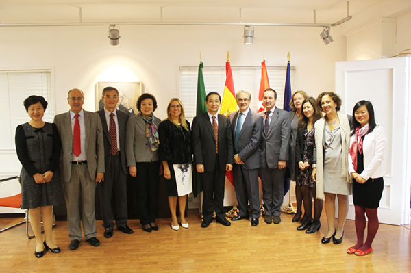 签字仪式后,大家互换礼物。在接下来的理事会上,马德里孔子学院外方院长Isabel Cervera 做了2012年孔院工作报告, 然后三方讨论建立马德里孔子学院基金会的章程。上外校长曹德明提出利用孔子学院平台,进一步扩大两校的交流合作,在师生的交流、合作研究等方面更进一步。曹校长承诺将给孔子学院5-10名优秀学生去上外学习的奖学金,免学费,免住宿费。也资助5-10名西班牙本土汉语教师去上外进修。会后曹德明校长在马德里自治大学作了题为“中国高等教育与外语教育”的讲座。(马德里孔子学院)