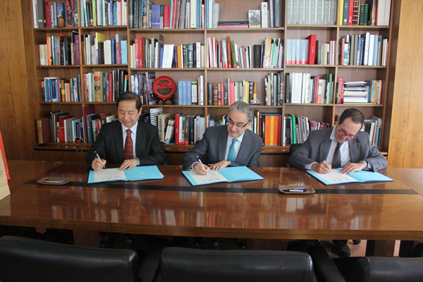 2013年10月14日上午,上海外国语大学校长曹德明、上外孔子学院及国际汉语教育中心秘书长徐宝妹、外事处处长张红玲、西方语系主任陆经生一行来到西班牙马德里自治大学,参加了上海外国语大学、马德里自治大学与亚洲之家合作建设马德里孔子学院特别协议的签字仪式,并召开了马德里孔子学院第一届理事会。马德里自治大学校长José M. Sanz, 国际关系副校长Amaya Mendikoetxea和亚洲之家主席Ramón Mª Moreno González、秘书长Montserrat Riba I Cunill 等人参加了仪式。该协议的签署明确了上外作为马德里孔子学院新的中方合作院校的地位。