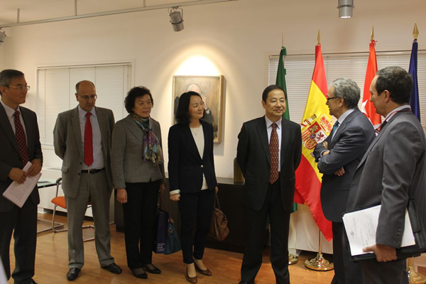 马德里自治大学校长为曹校长一行举行了简朴而隆重的欢迎仪式。他首先致辞,对远道而来的中国客人表示热烈欢迎。然后他简单介绍了马德里自治大学及其所处的马德里市。Sanz校长高度赞扬了上海外国语大学的办学实力,表示对马德里自治大学与上外的合作非常满意,非常期待。曹德明校长对马德里自治大学精心安排这次合作协议签署仪式表示衷心感谢。他表示孔子学院是中西开展教育和文化交流的桥梁,是西班牙民众学习中文和了解中国悠久历史和璀璨文化的平台,是增进中西人民相互了解和友谊的纽带。马德里孔子学院的建立,标志着西班牙与中国的友好合作进一步深化。希望马德里孔子学院真正成为马德里及其周边地区学习和推广中国语言文化、促进中西人民友好的基地。