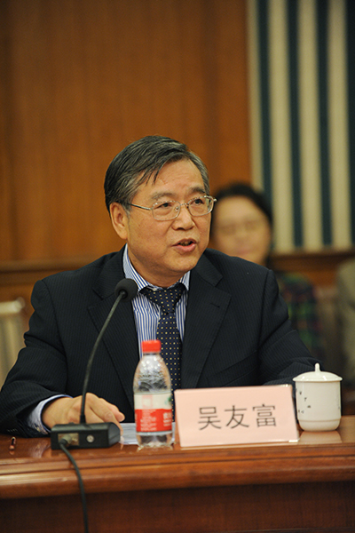吴友富代表上外对虹口区委、区政府一直以来对上外附中办学事业和附中东校建设的关心与支持表示感谢。他指出,当前,上海正以建立自贸区为标志,加快打造改革开放、转型发展升级版的步伐。当前和未来,上海建设四个中心、实现四个率先、建设国际化特大型都市的现实需求和长远目标,都需要加快培养和造就一批又一批外语能力出众、跨文化交流能力过硬、国际视野宽广、德智体美全面发展的国际化英才。为国家和上海培养高素质外语人才,势在必行,不容迟缓,更是上外长期以来自觉担当的重要使命。我们将充分发挥上外及上外附中在外语教育尤其是多语种教育方面的优势,与虹口区政府一起,汇集最优秀的教师,高起点办好上外附中东校,使上外附中东校成为一所现代化与国际化特色鲜明、软硬件设施齐全、外语教育尤其是多语种教育质量上乘的高水平特色外国语学校。