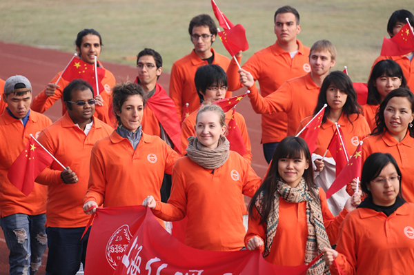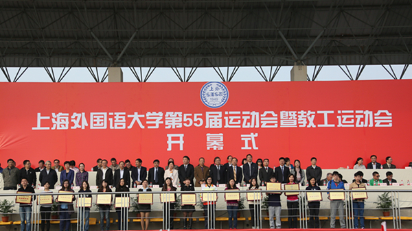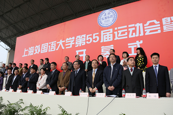 迎着秋日温暖的阳光,感受着秋风的凉爽惬意,2013年11月6日上午8时30分,伴随着欢快激昂的《运动员进行曲》,上海外国语大学第55届运动会暨教工运动会在松江校区体育场拉开帷幕。校领导吴友富、曹德明、李月松、王静、冯庆华、张峰、周承,松江大学园区管委会主任吴楚武、上海市学生体育协会联合秘书处秘书长沈幼伟及各院系部门党政负责人、校体委会委员和近千名师生员工出席了运动会开幕式。校体委副主任、校体教部主任王骏主持了开幕式。