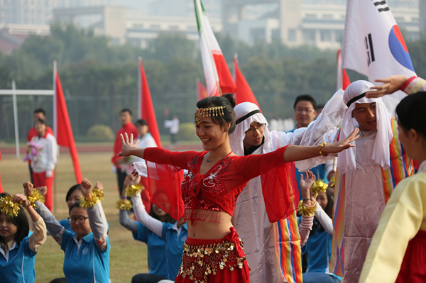 随后的文艺表演中,由324名女生组成的红旗舞队以其强大的阵容、恢弘的气势,整齐耀眼的着装,为观众带来了一场视觉盛宴。开场她们踏着激昂奋进的旋律,高举旗帜,从四面八方涌来,整齐划一地挥舞着红旗,舞出上外人的意气风发,舞出上外人的锐意进取,舞出上外人的梦在四方,志存高远。各式造型的变换,从代表母校与学子情的回字形波浪摆动到组合字变化,诠释着上外学子将上外精神牢记于心,努力践行,以青春为笔,汗水为墨,谱写成长的篇章。紧接豪情万丈的红旗舞后迎来了由我校14个院系100多名学生组成的活力四射、青春无限的啦啦操代表队。动感的舞姿、挥舞的花球充分展现了上外人青春的无穷魅力:青春是多彩的,青春是激情四射的,青春是蓬勃向上的,艺术舞动青春,美丽彰显校园。