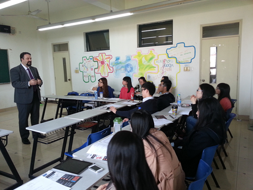 随后,Ryan先生与我系四年级西班牙语专业学生进行了交流。在简要介绍INCAE商学院后,Ryan先生和同学们阐述了他多年来在世界各国工作的经验和体会,向同学们介绍了怎样才是一个合格的国际化人才,并和同学们现场小小的演绎了一下他的课堂辩论教学法。Ryan先生向同学们介绍到,拉丁美洲是中国的第二大投资目的地,因此构建起拉丁美洲和中国的有效沟通是必备的桥梁和纽带,而这并不是靠掌握语言能够达到的,还需要充分的跨文化沟通能力,所以希望所有在座的同学可以扎实学习语言,同时充分了解拉美,走近拉美,成为双方共同发展的推动力。(西方语系)