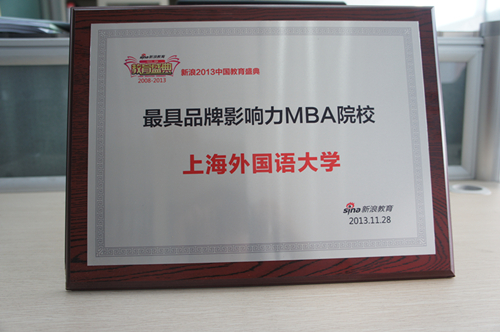 2013年11月28日,由新浪教育频道主办的“2013年度教育盛典”活动在北京辽宁大厦举行。本次活动的主题为“大数据时代的中国教育”,活动现场揭晓了“2013年度最具品牌影响力MBA院校”、“2013年度杰出贡献教育人物”、“2013年度十大品牌影响力中外合作院校”等多个教育领域的奖项。上海外国语大学的MBA项目荣获“2013年度最具品牌影响力MBA院校”奖。