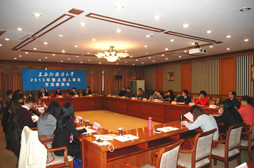 2014年1月3日下午,校学生处在虹口校区英伦厅举行了“云间冬暖——上海外国语大学2013年重点用人单位交流座谈会”。