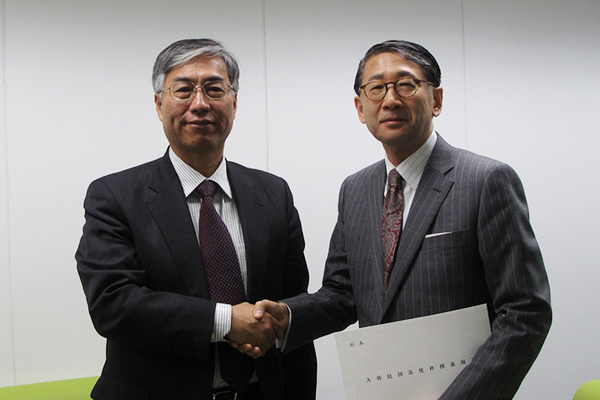 邱国洪大使(左)向韩国外交部仪典长崔钟贤递交国书副本