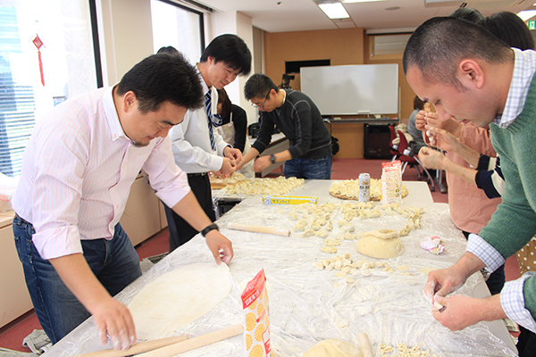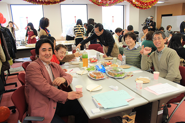 联欢会主持人李颖莹和周骏一两位老师中日双语主持,妙语连珠,还在各节目之间穿插了新年大抽奖和特色汉语宾果游戏、中国文化知识问答、汉语猜猜猜等适合所有来宾共同参与的活动,大家兴致勃勃、积极踊跃。联欢会进行的同时,产大的中国老师们则在会场后方忙着制作中国最传统的过年佳肴——饺子,现场展示了和面、擀皮、调馅、包饺子等制作饺子的全过程。来宾们不仅吃到了一盘盘热气腾腾、美味可口的饺子,还学到了中国饺子的制作方法和技巧,更加深刻了解了中国传统新年的文化内涵。