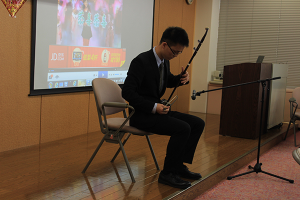 欢声笑语中,孔子学院的教师和学员们以及大阪产业大学的中国留学生纷纷登台助兴。中级B班和初级C班以及中级会话班的日本学员们分别合唱了他们喜爱的中国歌曲《恭喜恭喜》和《好春天》,森本初子同学独唱了浪漫感人的《最浪漫的事》,孔子学院的周骏一老师演奏了委婉动听的二胡曲目中国的《良宵》和日本的《涙そうそう》,产大的中国留学生则带来了婉约唯美的中国民族舞蹈《惊鸿舞》……一个个精彩的节目把联欢会气氛推向一个又一个高潮,现场观众无不拍手称赞。