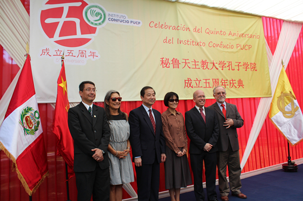 秘鲁天主教大学副校长卡洛斯·富斯曼(Carlos Fosca)代表大学对孔子学院成立五周年表示热烈祝贺,并特别感谢上外赠送孔子青铜立像给秘鲁天主教大学,表示秘鲁天主教大学认同孔子重视教育的理念,这尊立于大学校园的孔子铜像代表秘中两国超过160年的友谊和良好合作关系。