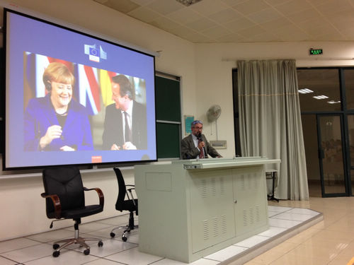 在讲座中,David Smith 先生从欧盟的起源谈起,阐述了这一构想带来的种种变化,并向在场的师生解释了欧盟工作中多语言特色背后的原因与价值。随后,David Smith 先生具体介绍了欧盟口译员的工作情况及欧盟多语言环境下的口译工作机制。在讲座的最后部分,David Smith先生结合其自身经历,阐述了他眼中优秀译员所需要具备的素养以及作为口译员工作的收获与快乐。