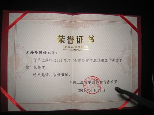 上海外国语大学是获得2013年度“全市外宣信息供稿工作先进单位”荣誉表彰的本市唯一一所高校。