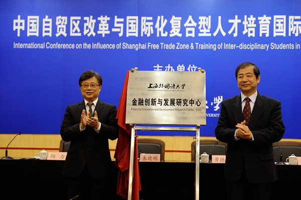 会上还举行了上海外国语大学金融创新与研究中心成立揭牌仪式。校长曹德明与中欧国际工商学院院长朱晓明共同为中心成立揭牌。金融创新与发展研究中心的成立,旨在主动对接国家新型高校智库建设战略规划,整合我校现有研究资源,推动我校复合型专业学科建设和科研繁荣,提升我校在服务地方经济建设和金融决策咨询中的影响力。同时,中欧国际工商学院院长朱晓明受聘为我校兼职教授。他表示,加盟上外是一个机遇,一定结合学校的语言学科优势,在课题研究、知识共享与师生互动交流等各方面全面推进上海外国语大学与中欧国际工商学院的深层次合作,共同推动上海国际金融中心的建设。