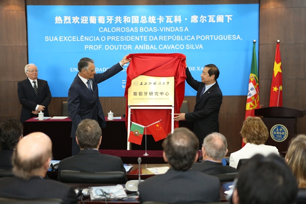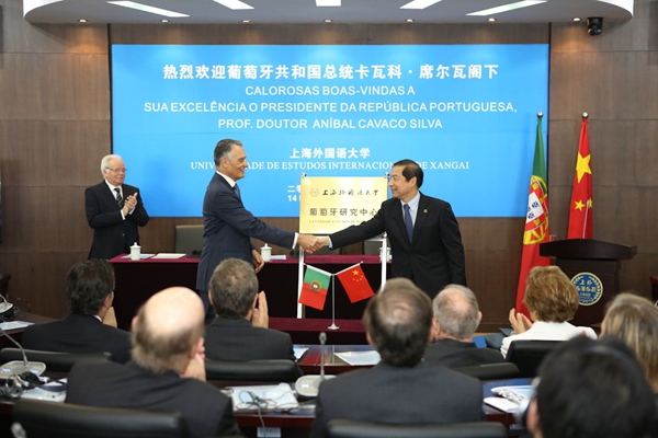 在全场热烈的掌声中,席尔瓦总统和曹德明校长为新成立的上海外国语大学葡萄牙研究中心揭牌。