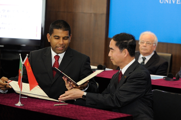 里斯本新大学副校长佩雷拉致词对两校合作协议的签署表示祝贺,并表达了两校合作向更多领域发展以取得更多成果的美好愿望。