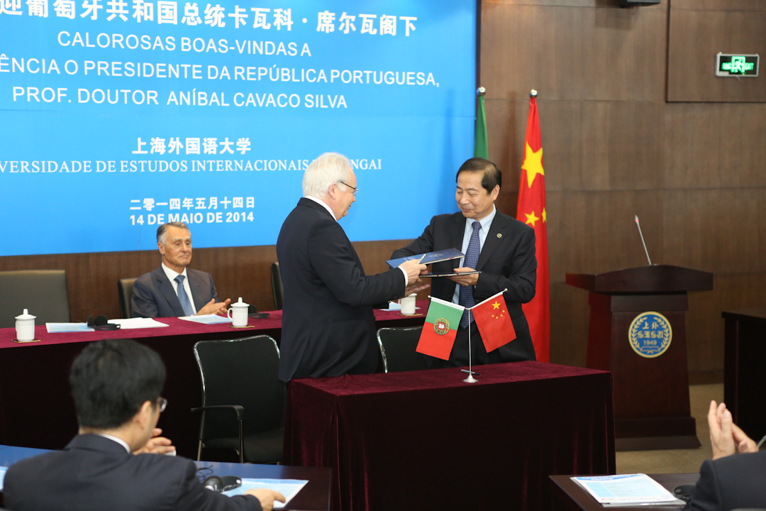 由席尔瓦总统见证,上海外国语大学和葡萄牙里斯本新大学商学院签订了两校合作框架协议。曹德明校长和里斯本新大学副校长佩雷拉分别代表上外和里斯本新大学签署了两校的框架协议。上外副校长冯庆华和里斯本新大学商学院副院长特拉萨签署了两校“2+2”本科双学位项目协议。