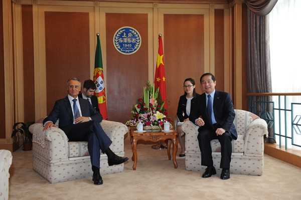 在会议中心贵宾厅,曹德明校长和席尔瓦总统一行举行了简短的会谈。曹德明对总统的来访表示热烈欢迎。他指出,中国与葡萄牙建交35年以来,两国关系发展顺利。近年来,双方在政治互信、教育、经贸等领域的合作富有成效。在此背景下,上海外国语大学与葡萄牙之间也保持着友好的交流往来。曹德明表示,席尔瓦总统的来访对加强上外与葡萄牙高校等方面的交流有着非常重要的意义。他希望今后能有更多的机会与葡萄牙高校进行合作,共同发展。
