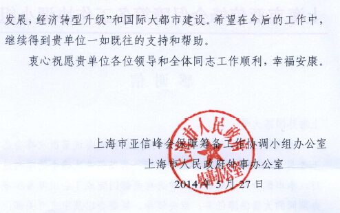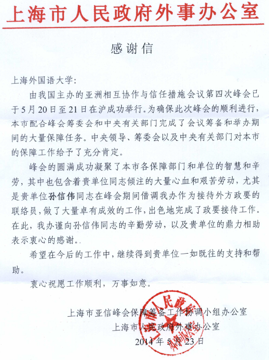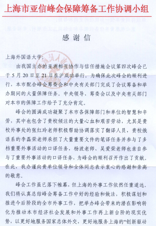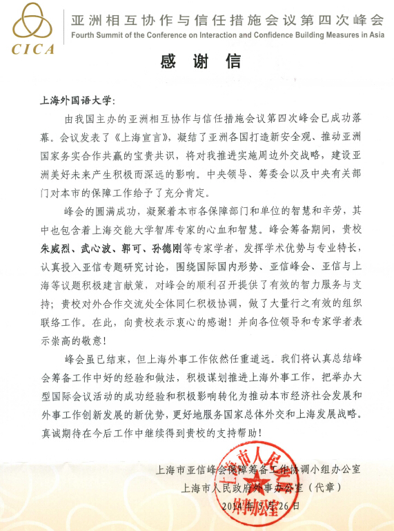 由我国主办的亚洲相互协作与信任措施会议第四次峰会已成功落幕。近日,我校陆续收到上海市亚信峰会保障筹备工作协调小组办公室、上海市人民政府外事办公室寄来的感谢信。信中特别提及我校人事处孙信伟处长、对外合作交流处张红玲处长、俄语系李磊荣、杨波、吴爱荣等老师积极协助参与大会的联络、翻译等工作,以及朱威烈、武心波、郭可、孙德刚等教授积极为大会专题研究讨论建言献策,对我校专家、教授为大会的顺利召开所作出的贡献给予充分的肯定,并表示衷心的感谢。市外办等部门希望我校在今后的工作中,能一如既往地支持上海的外事工作,总结亚信峰会的成功经验,更好地服务上海的“创新驱动发展,经济转型升级”和国际大都市建设。