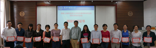最后,杨力副校长为结项团队颁发荣誉证书并作重要讲话。他指出,上海外国语大学首批青年教师科研创新团队建设,是在教育部提出“造就一批学贯中西、享誉国际的名家大家,一批功底扎实、勇于创新的学术带头人,一批年富力强、锐意进取的青年拔尖人才,构建结构合理的哲学社会科学人才队伍体系”要求以及我校落实《繁荣计划》建设任务的背景下开展的 。当前,我校发展面临着来自各方面的巨大压力和严峻挑战。上外要发展,就必须立足于多语种、跨学科、跨文化的专业特色,有效整合优质资源,不断强化传统优势,以体制机制创新为关键,以学科交叉融合为路径,以区域国别研究为主攻方向,积极对接国家需求,不断加强智库建设和对策研究,以北大等先进院校为标杆,认真对照研究,找出差距,提出对策,努力提升我校外国语言文学专业的整体实力。